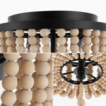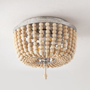 - A flush mount with serious style: neutral-toned wood beads and a glam gold finish accentuate this beaded fixture