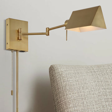 - This wall-mounted light can either be hardwired or plug into a standard outlet; has a pull-chain for turning on the light and includes an adjustable 36" rod to conceal the wire
