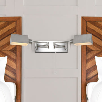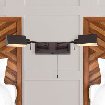 - Give your tables an uncluttered look; wall-mounted swing lights add a farmhouse touch over the sofa or bed
