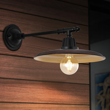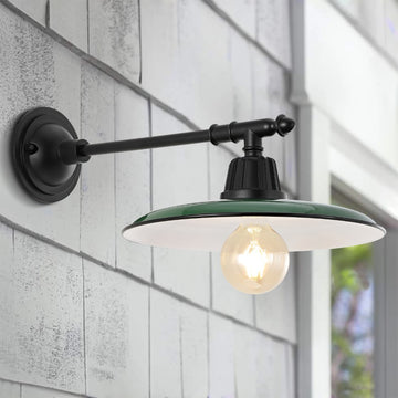 Our metal wall light adds a modern touch to a classic farmhouse look. A flat painted shade and a straight bracket set off the warm globe LED bulb. Use this outdoor light fixture indoors too for residential and hospitality projects.