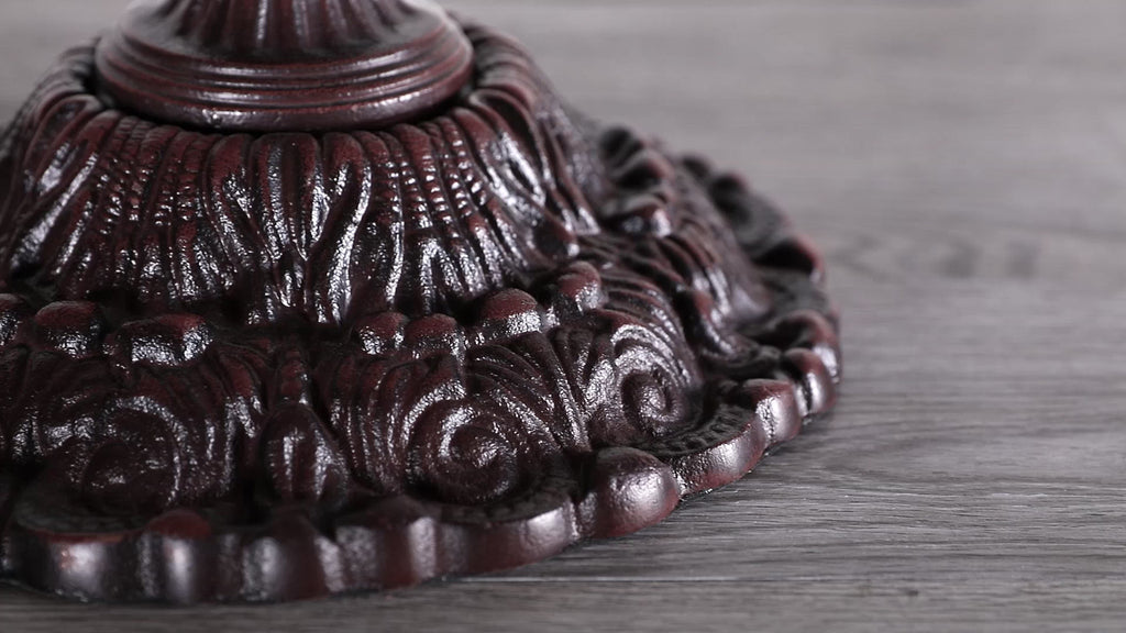One of the finest techniques to come out of the Art Nouveau movement, the Tiffany-style stained glass shade on this torchiere floor lamp makes for a stunning addition to any space. While steeped in traditional design with it's barley-twist base and green botanical motif on the shade, this piece is updated with the functionality expected today -- a step-on on/off button, LED bulb compatibility, and a beautiful silk-wrapped cord. Each shade is hand-made by artisans who specialize in the intricate art of stained glass soldering.