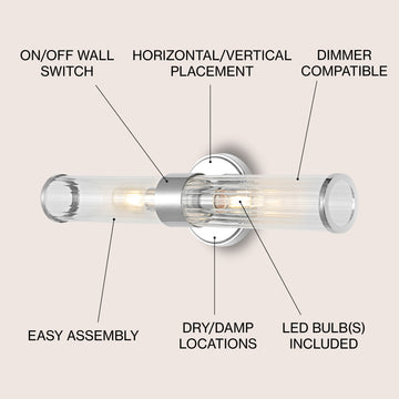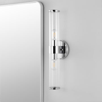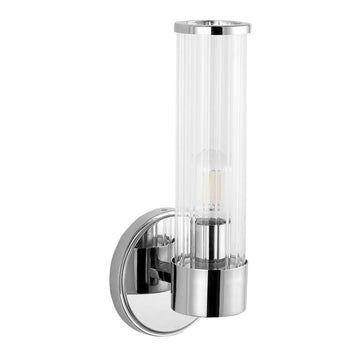 Add vintage glamour to your master bath with our classic mid-century style chrome wall light. A single Edison-style LED bulb in a clear glass cylinder provides plenty of light. Make a statement with two of these large sconce lights flanking a mirror, or use them to light a hallway. Clean lines and a sparkling chrome finish add modern Art Deco style to your bath vanity, hallway or entry.