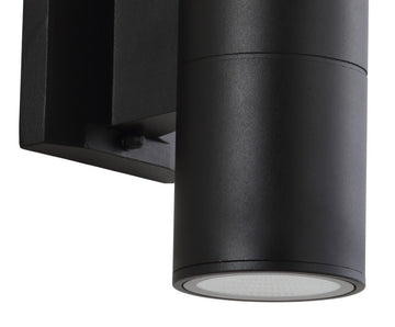 Understated and functional, this black cylindrical wall light shines both up and down. Solid metal construction features a sturdy square backplate and glass covers for the bulbs. Ideal as accent lighting for a courtyard or wall; use several to illuminate your home's architecture.