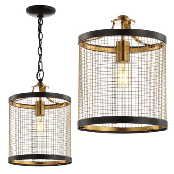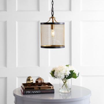 A brass grid surrounds and softens the light from a single bulb in this stylish pendant. With black exterior rings, the reflection of the light on the golden interior creates a warm glow, while the sturdy construction makes it a work horse for any high traffic space. Best of all, the drop is adjustable so it can be altered to suit any ceiling height.