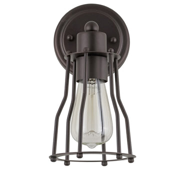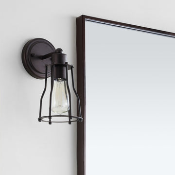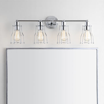 Define your bathroom or vanity space with the handsome industrial look of this chrome sconce, which can be hung in either direction according to your preference. This classic industrial cage bath light features a hand-worked chrome-plated frame and round wall plate in a polished finish. Edison-inspired bulbs add a vintage touch within the fixture, while the machined details of the shade cage evoke the turn of the century, when exposed bulbs were in vogue as only the most affluent households had upgraded to electricity from candlelight. This trend-forward, yet classic style is sure to be a classic for another century to come.