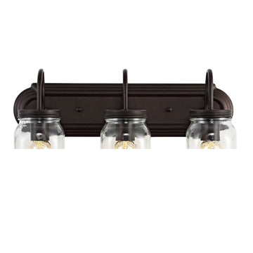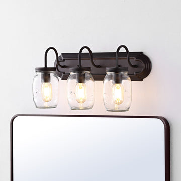 Add farmhouse flair to your kitchen or dining room with our Mason-jar Edison bulb vanity light. Three LED bulbs in a glass jar provides plenty of warm light. A bronze finish add rustic, industrial style to any room.