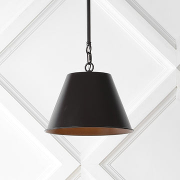 A traditional aesthetic and metal shade make this pendant light both stylish and practical. Farmhouse features include a decorative chain and a single Edison-style LED bulb for warm, bright light. At just 12" wide, this classic pendant is perfect for hanging over a kitchen island, dining table, or on each side of a centered bed.