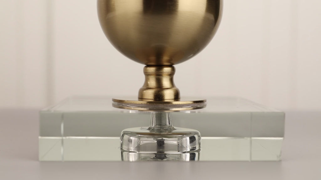 In the 1960s, when details on the space race headlined the cover of every magazine and the Russian's sputnik satellite inspired a whole movement in futuristic home décor, rod and ball construction really had a moment. We've revived the best of that construction and plated it in a modern brass finish so that it simultaneously harkens the past and beckons to the future. Situated atop a clear base, the combination of metal and crystal paired with a cotton drum shade make for a versatile piece that will last for decades to come.