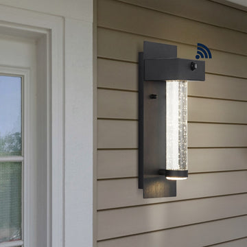 Our minimalist outdoor LED sconce is controlled by a sensor that can be leveraged to respond to the position of the sun or left off for bright environments. This innovative solar responsive sconce is a perfect addition to any outdoor space. Built from a sleek metal frame and crystal shade, this light adds a dose of mid-century design to any patio or entryway.