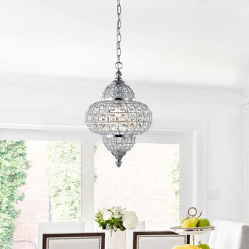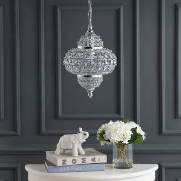 Moroccan quatrefoil lanterns inspired the shape of this stunning chandelier, which finished in crystal is elegant and glamorous. The chain is adjustable, allowing maximum versatility for any ceiling height. We love hanging a trio at different heights in a foyer or a single over a seating nook for a lux look.