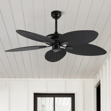 This fan's vintage silhouette with palm-frond blades gets a modern touch in an all black finish