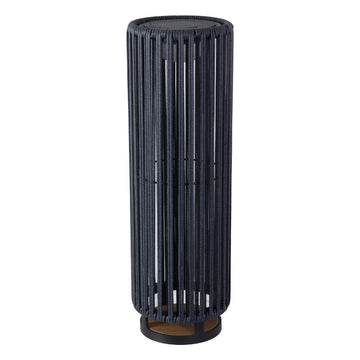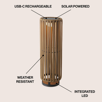 This modern, minimalist outdoor lantern adds dramatic accent lighting to the patio, deck or porch. Made from durable plastic rattan, this solar-powered lantern turns on at dusk and off at dawn. The sleek clyinder shape features a bright LED bulb and a battery that can recharge in the sun, or with a standard USB-C cable (not included).