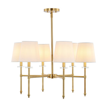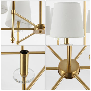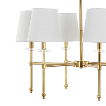 This linear chandelier's elegant modern frame features lucite accents and linen shades in a sleek, minimalist design