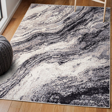 - Deep charcoal against a soft gray and cream background gives this modern rug a marbled look