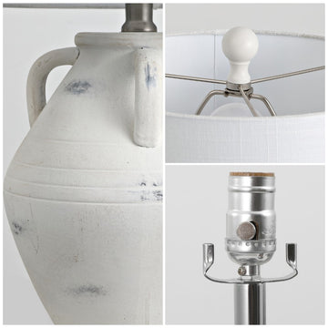 - Vintage style white ceramic jar base with a white linen drum shade