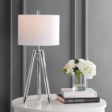 The timeless surveyor's tripod lamp is re-interpreted as a glamorous, modern table lamp in glass and chrome. A statement piece for the living room, den, or office, this lamp features an ivory linen drum shade and bright LED bulb. A black silk-wrapped cord is an elegant finishing touch.