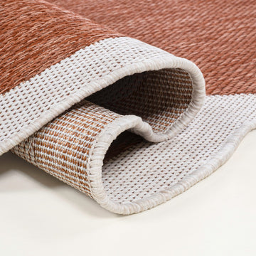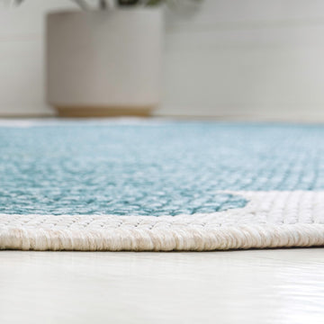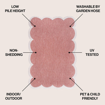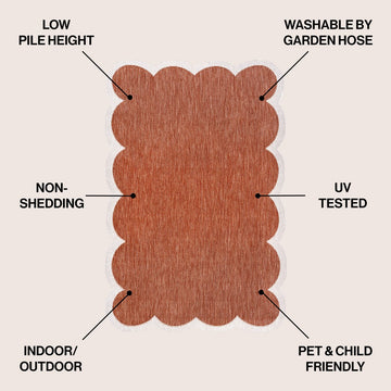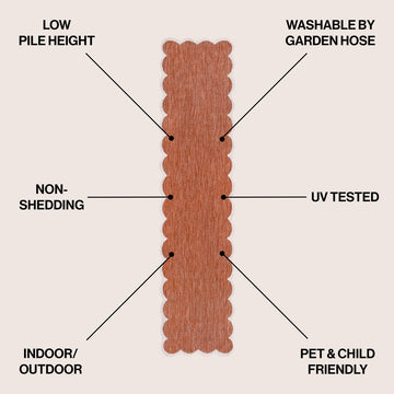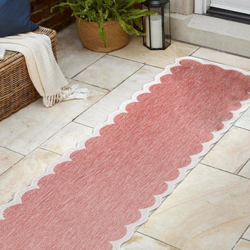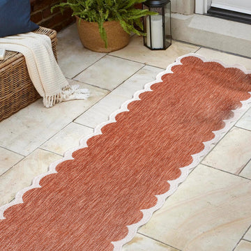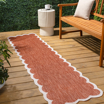 In classic cottage style, this charming indoor/outdoor rug features a scalloped edge and two-toned color scheme. Use it outdoors on a porch, or in the living room, entry, bedroom or dining room. Woven from synthetic fibers, this easy-care rug is family-friendly and durable.