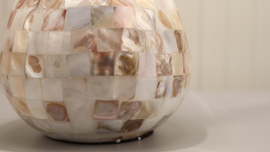 The refined teardrop shape of this seashell-embellished table lamp creates a modern take on this coastal classic. With a mosaic made from the pearlescent interiors of collected seashells, the mother-of-pearl type finish on this gorgeous base simultaneously emotes seaside glamour and luxe living. If your room needs a touch of refinement and the warm glow of a perfectly scaled 20.5" table lamp then you cannot go wrong with this beautiful piece.